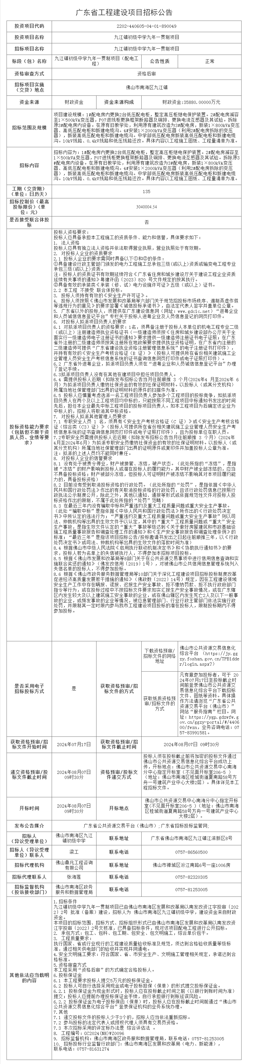 南海九江镇初级中学九年一贯制项目(配电工程)招标公告