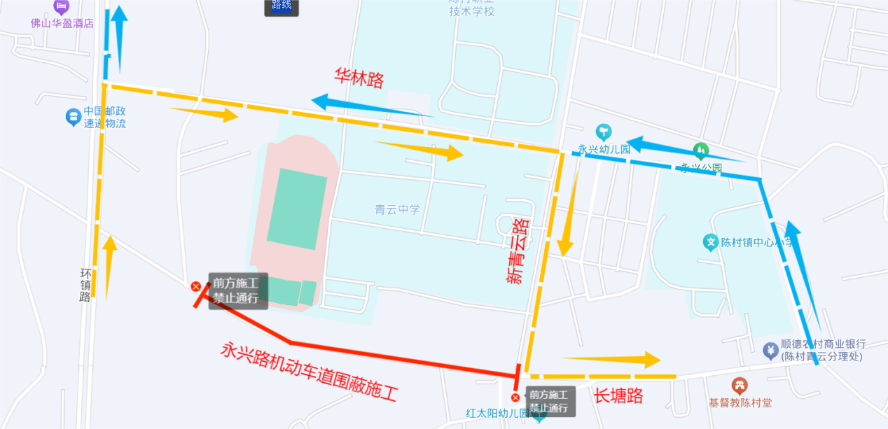原经永兴路前往长塘路方向的社会车辆,可通过绕行环镇路——华林路——新青云路前往;经永兴路前往环镇路方向的社会车辆,可通过绕行长塘路——华园路——华林路前往。