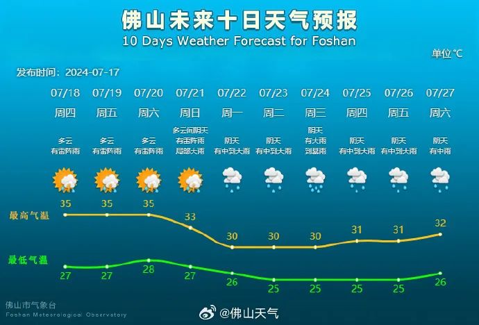佛山市气象台预计,预计未来三天,佛山多云,有雷阵雨,间中雨势较大。