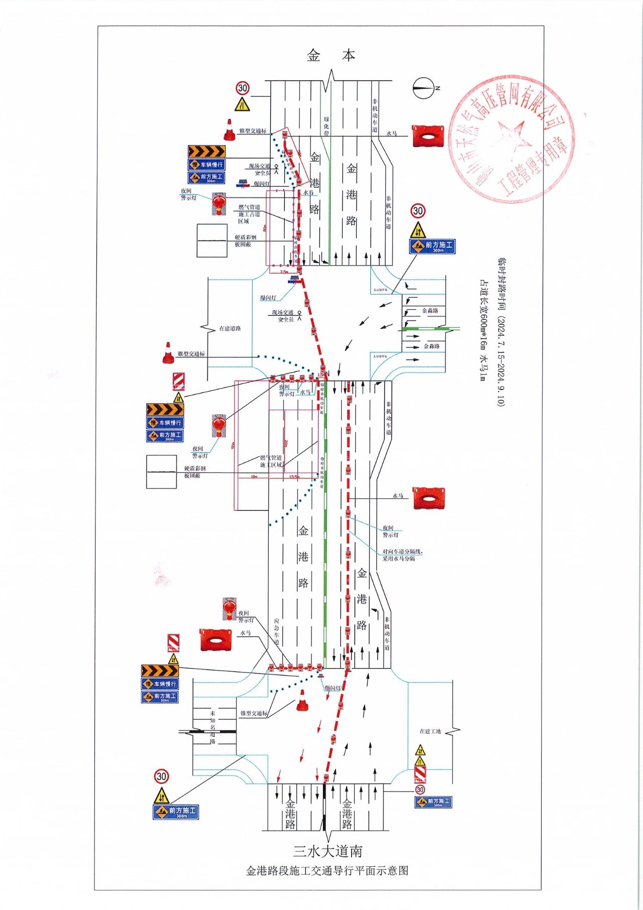 现乐平至白坭天然气高压管道工程项目-金本水都段即将施工,因施工位于金港路,需进行交通导改后方可施工。交通道改后金港路(金淼路路口)金本往三水大道南方向半幅车道封闭,过往车辆沿金淼路北侧半幅路面双向行驶。占道时间:2024年7月25日至9月10日。占道期间按交通安全标准设置警示标识、标牌,同时派人员疏导交通,确保交通安全。