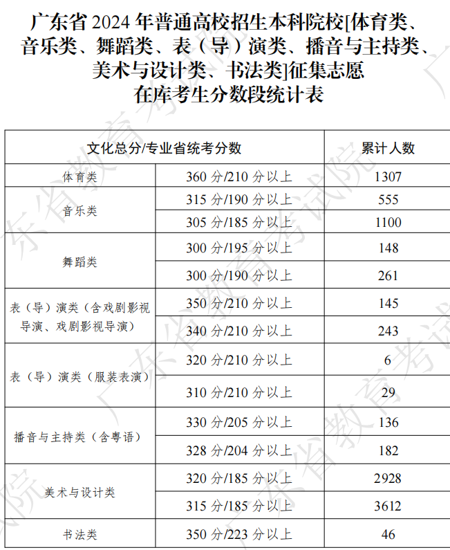 根据省教育考试院发布的在库考生分数段统计表,目前符合征集志愿条件的在库考生共68113人。其中,普通类历史考生18403人、普通类物理考生42930人、体育类考生1307人、音乐类考生1100人、舞蹈类考生261人、表(导)演类272人、播音与主持类(含粤语)182人、美术与设计类考生3612人、书法类46人。