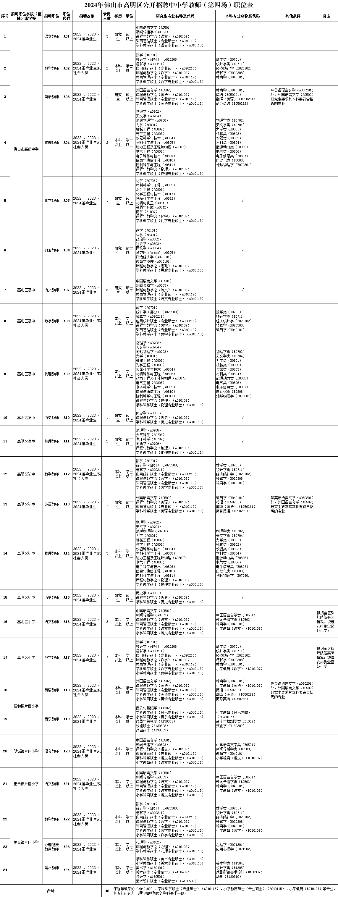 本次招聘中小学教师40名。具体详见《2024年佛山市高明区公开招聘中小学教师(第四场)职位表》(附件1)。
