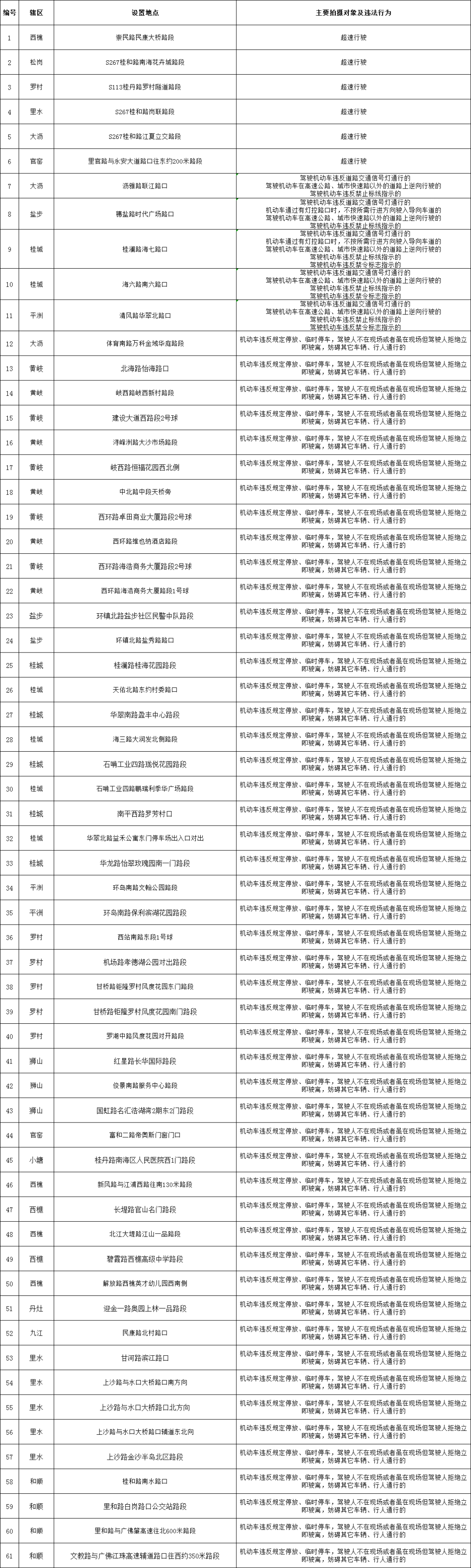 根据《中华人民共和国道路交通安全法》《中华人民共和国道路交通安全法实施条例》《道路交通安全违法行为处理程序规定》《广东省道路交通安全条例》等相关法律法规的规定,现将新增的电子拍摄设备进行公示,该批新增的电子拍摄设备将于2024年9月1日开始对交通违法行为进行执法取证。请广大车主和驾驶员自觉遵守交通法规,养成良好的文明交通出行习惯,共同营造安全、和谐、畅通的道路交通环境。