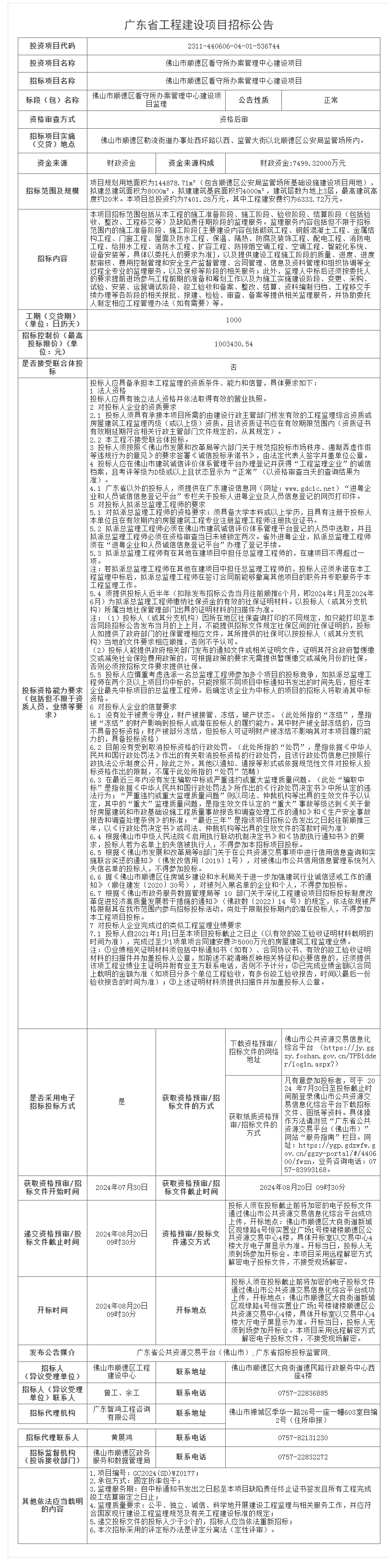 佛山市顺德区看守所办案管理中心建设项目监理招标公告