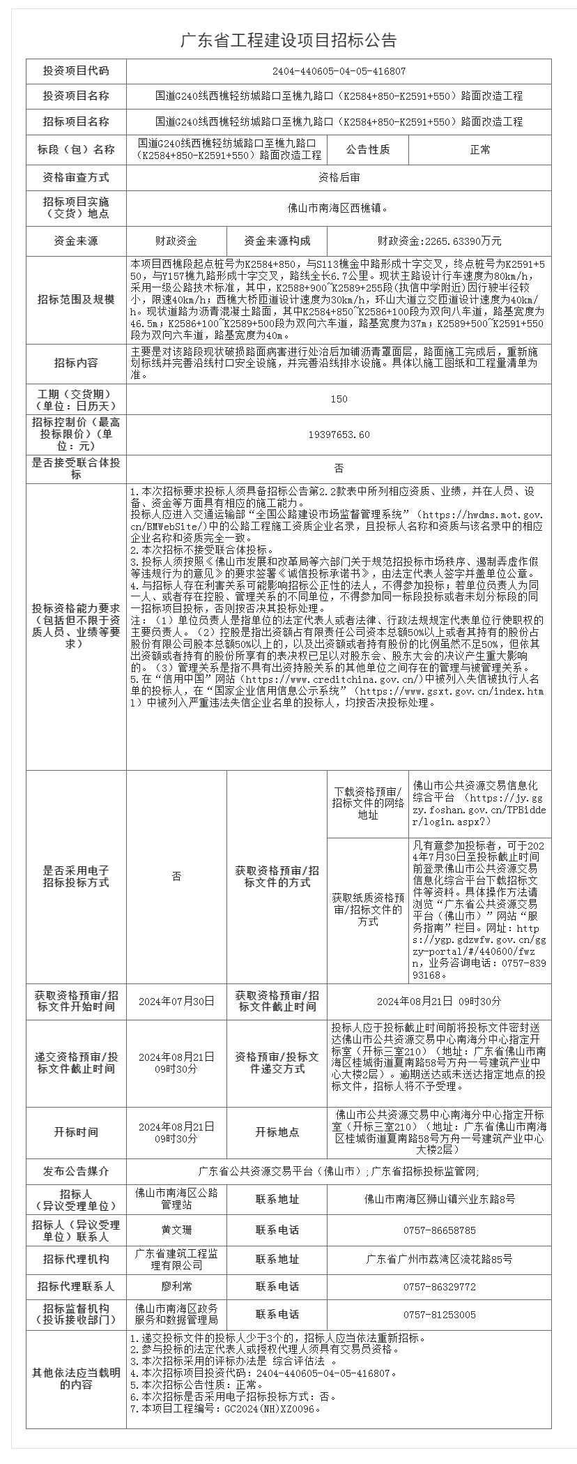 国道G240线西樵轻纺城路口至樵九路口(K2584+850-K2591+550)路面改造工程招标公告