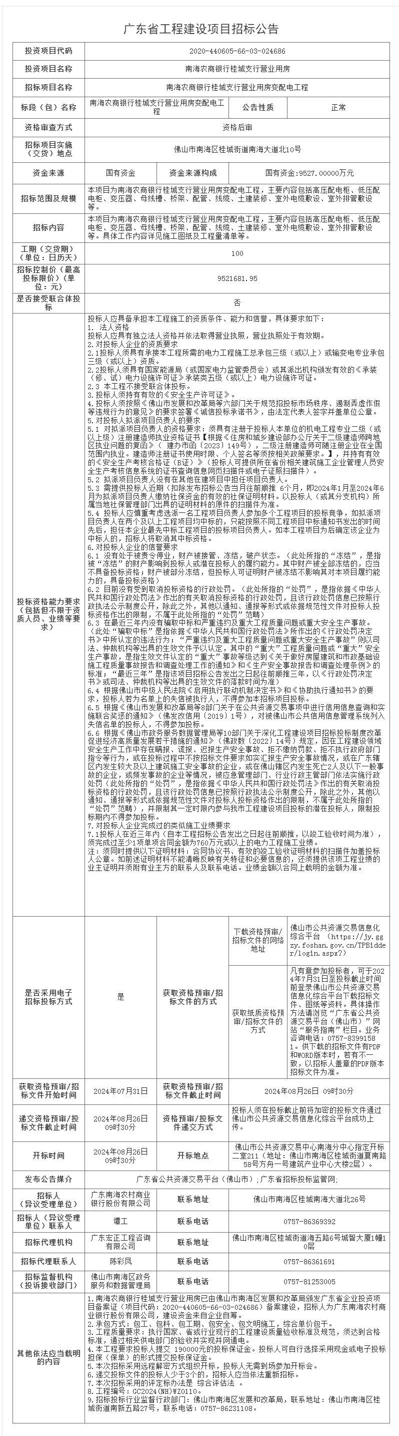 南海农商银行桂城支行营业用房变配电工程招标公告