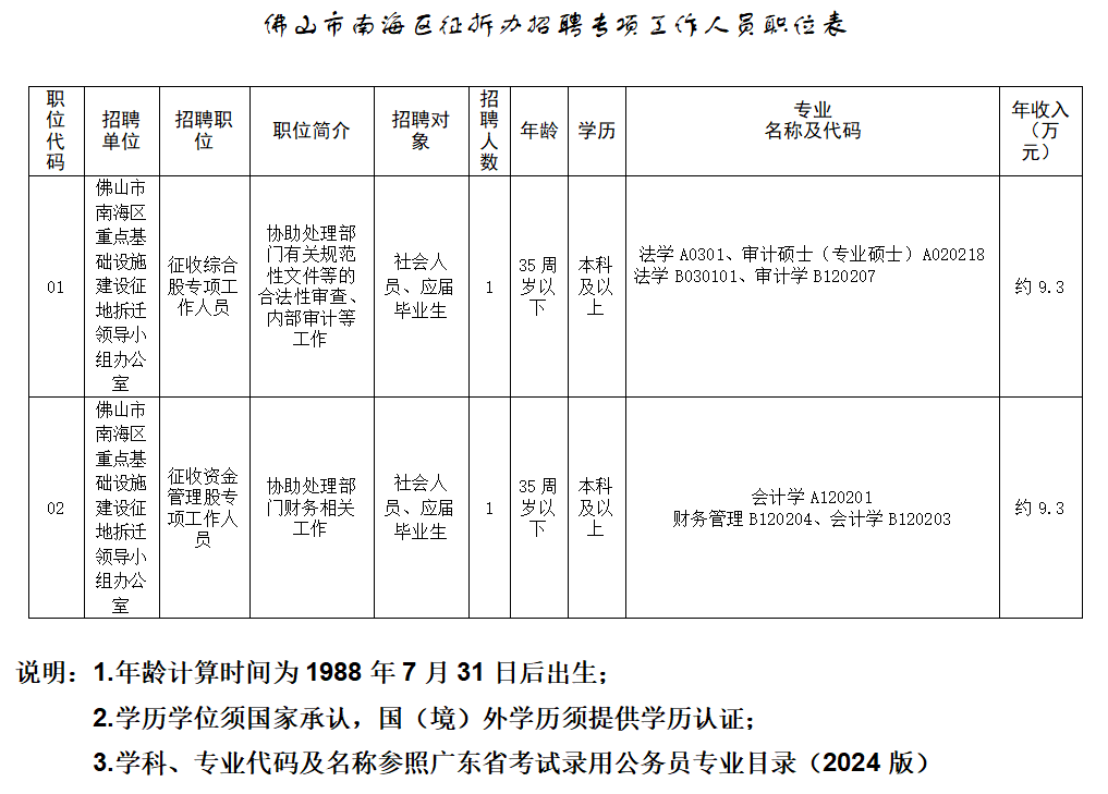 招聘职位及薪酬标准详见《佛山市南海区征拆办招聘专项工作人员职位表》(详见附件1)。