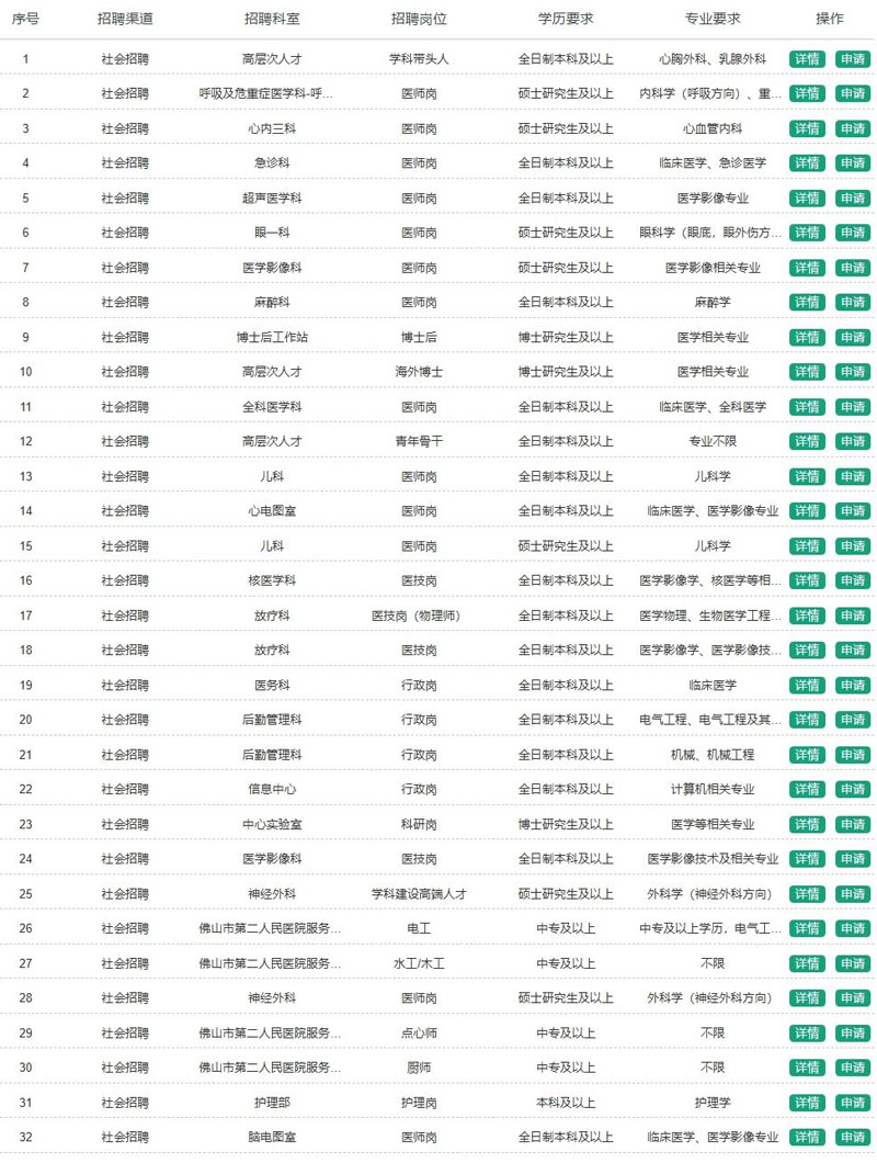 为进一步加强医院人才队伍建设,提升医院综合服务能力,引进高质量人才赋能高质量发展的需要,佛山市第二人民医院现面向社会补充招聘各类专业技术人员。