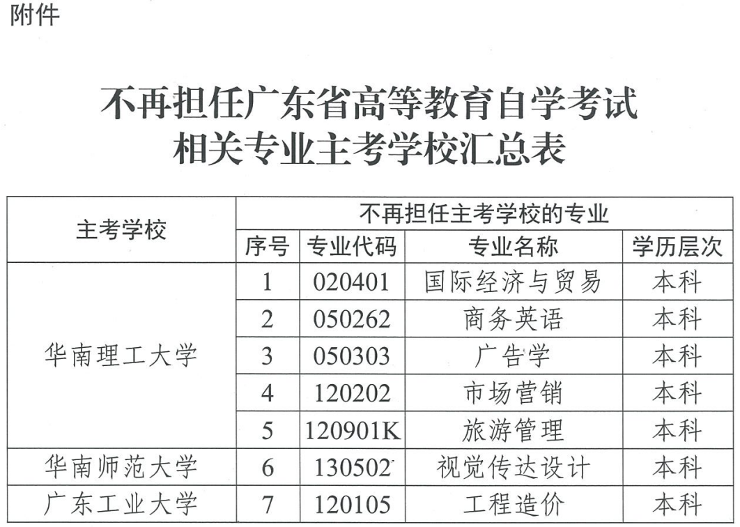 (一)华南理工大学等3所高校将不再担任广东省高等教育自学考试国际经济与贸易等7个专业的主考学校,具体情况详见附件。