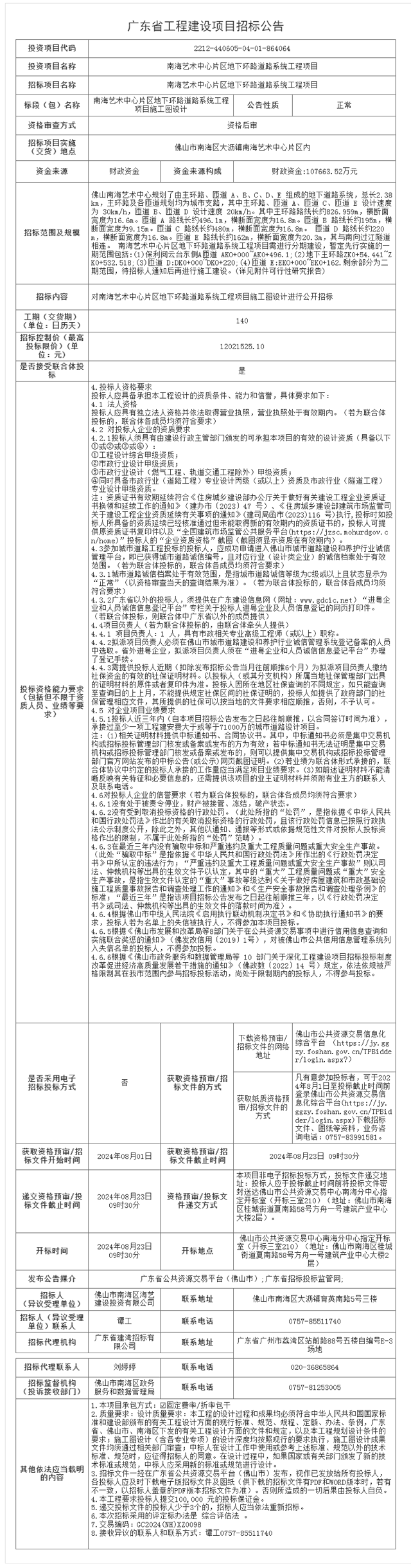 南海艺术中心片区地下环路道路系统工程项目施工图设计招标公告