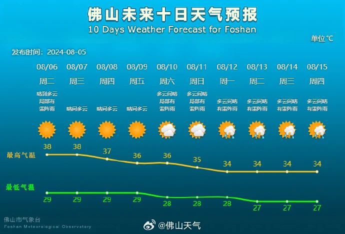8月6日:晴间多云,局部有雷阵雨,气温29°C~38°C。