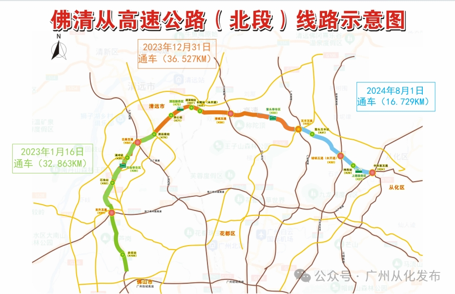 其中,佛清从高速北段工程广州花都赤坭至清远清城龙塘段于2023年1月16日正式通车。佛清从高速清远南至从化鳌头段于2024年1月正式通车。