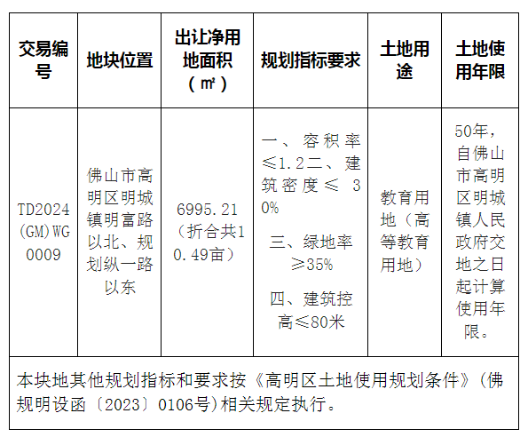 五、有意参与竞买者可于2024年8月5日后登录网上交易系统下载该宗地块的《佛山市高明区国有建设用地使用权网上挂牌出让文件》。