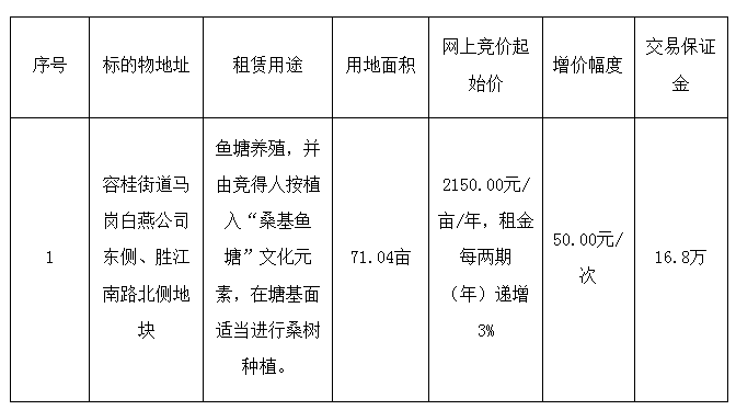 8.根据地块现状、特征,拟进行盘活利用管理,拟使用用途为 鱼塘养殖 ,并由竞得人按植入“桑基鱼塘”文化元素,在塘基面适当进行桑树种植。