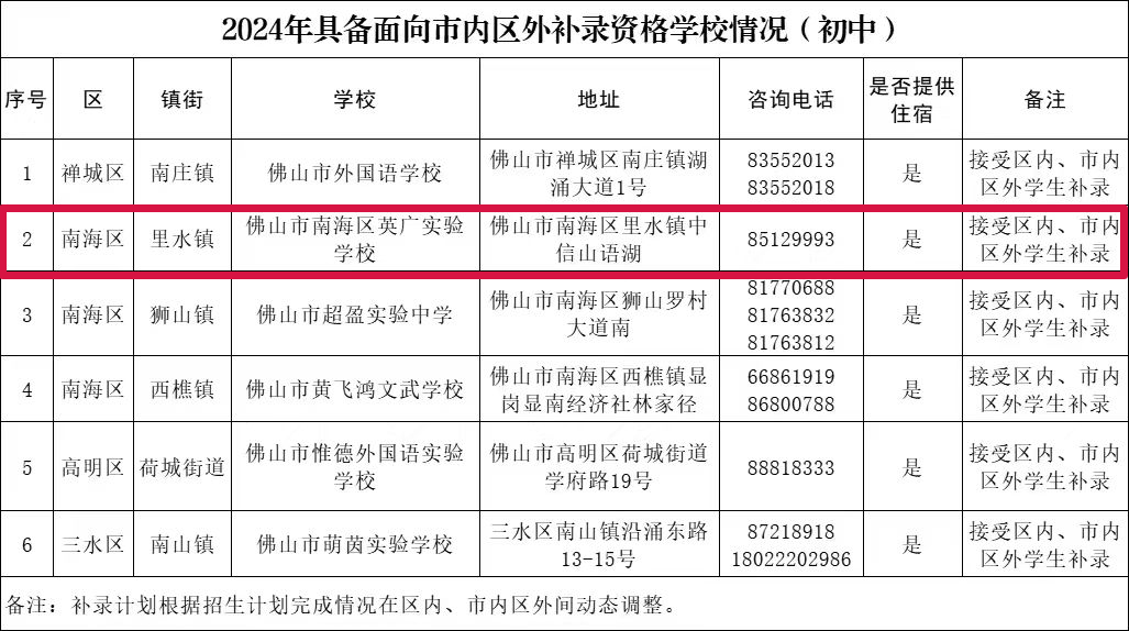部分由市教育行政部门审批且具有住宿条件的学校,在经过区内补录后,仍有部分学位。即日起,符合佛山民办义务教育学校报名条件且未被任何民办义务教育学校录取,有意愿报读的学生,可以主动联系学校申请补录。具体学校名单如下: