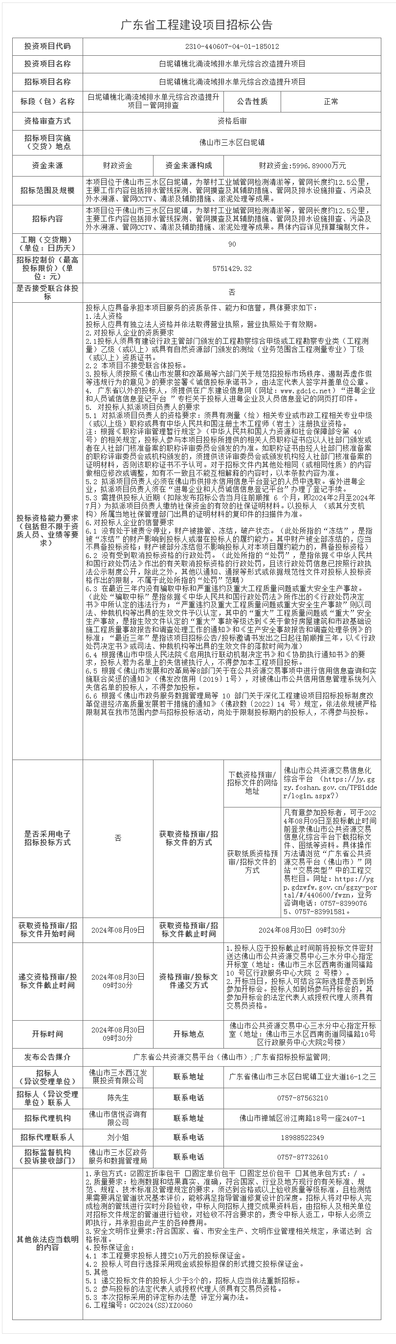 三水白坭镇樵北涌流域排水单元综合改造提升项目—管网排查招标公告