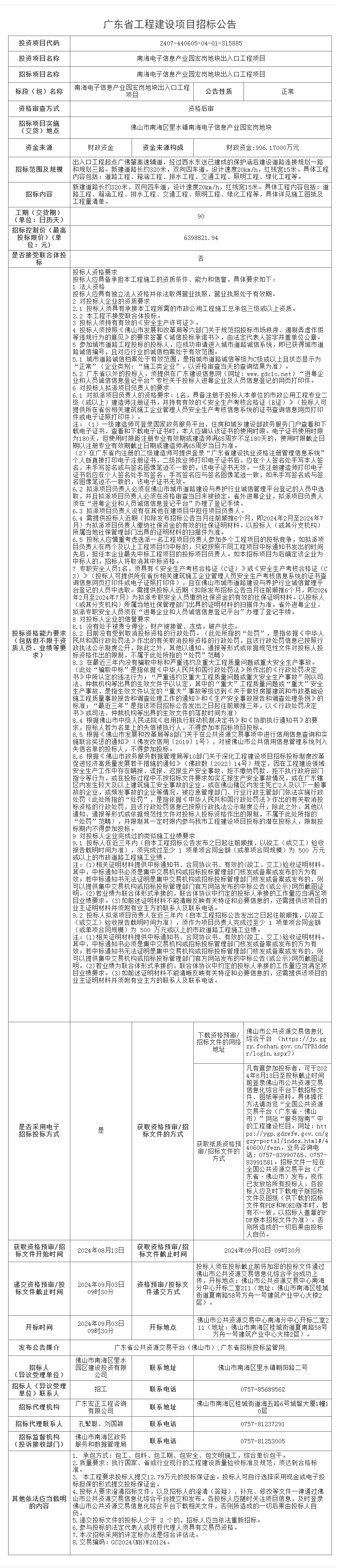 南海电子信息产业园宏岗地块出入口工程项目招标公告