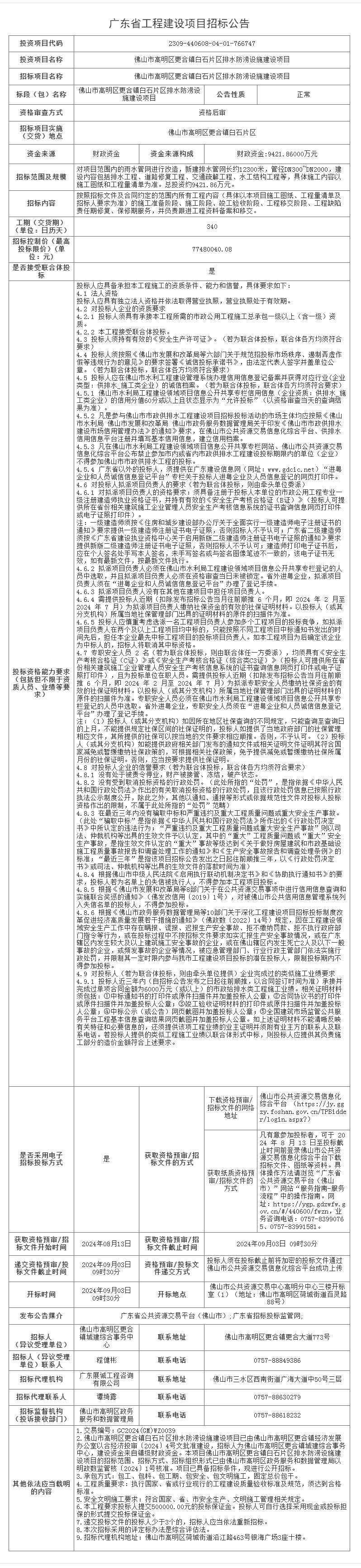 佛山市高明区更合镇白石片区排水防涝设施建设项目招标公告