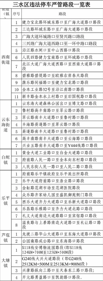 为进一步强化道路交通安全管理工作,提高道路通行能力,提升文明城市创建实效,确保道路交通安全、畅顺、有序,根据《中华人民共和国道路交通安全法》《道路交通安全违法行为处理程序规定》相关要求,结合我区实际,三水公安对我区违法停车严管路段作出调整,现通告如下: