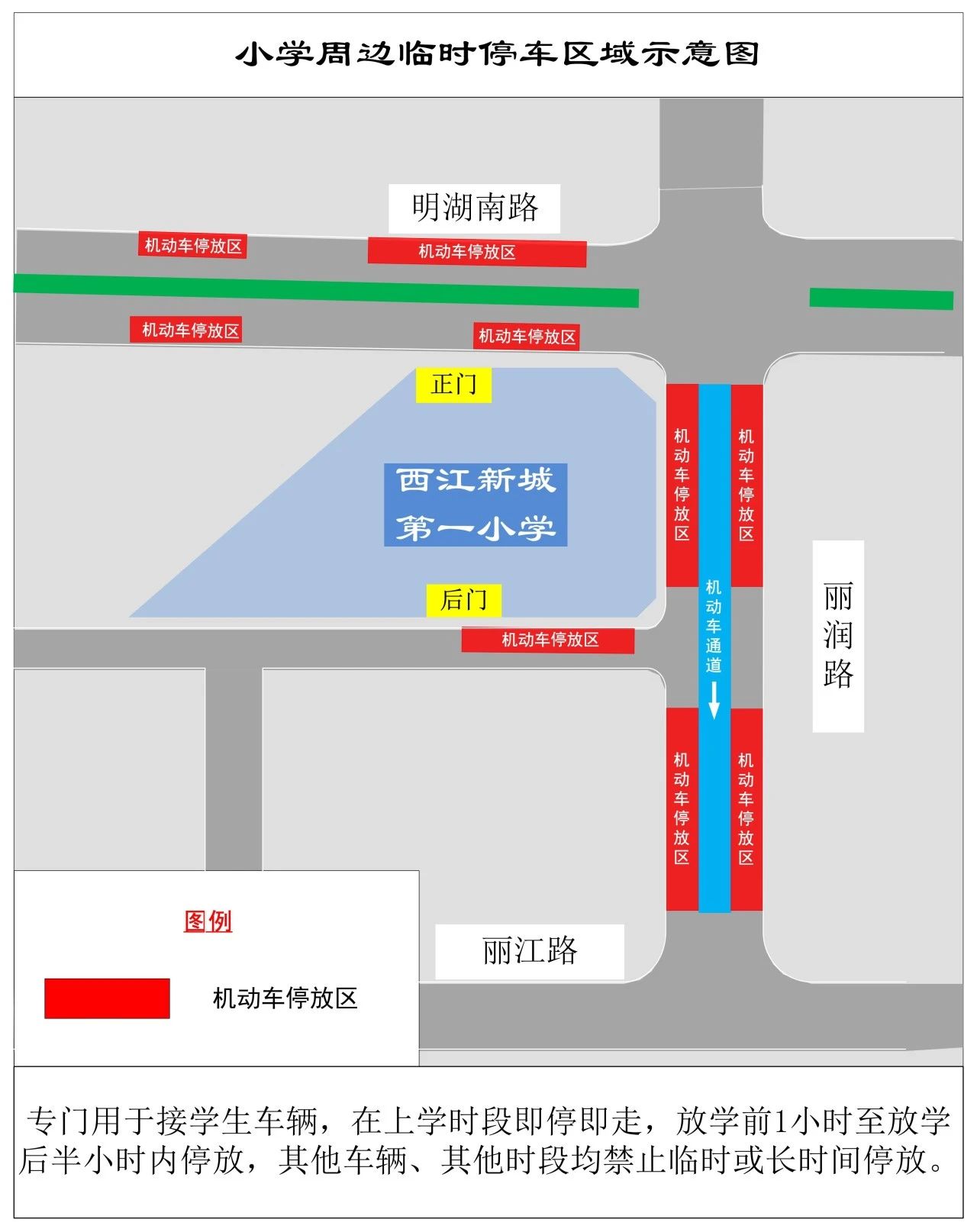 目前,西江新城第一小学接送车辆停车需求大,周边道路暂未设置足够的停车道,现有的停车位远无法满足接送车辆的停车需求,为了方便接送家长临时停放车辆,决定在明湖南路及丽润路设置可允许停车的区域,并只允许在上下学期间进行开放,具体的位置如下图所示: