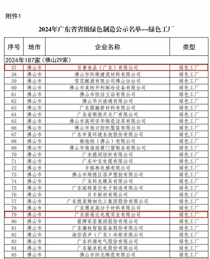 绿色制造是生态文明建设的重要内容,是工业转型升级的必由之路。近日,2024年度广东省绿色制造名单公示结束,其中,百事食品(广东)有限公司、广东新南达电缆实业有限公司在列!