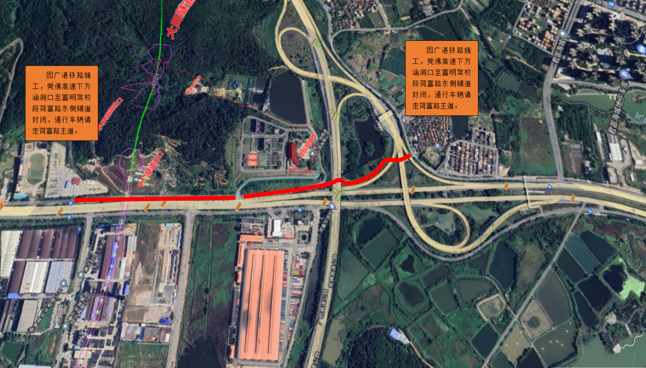 因广湛铁路施工延期,大型工程运输车辆需继续占用荷富路辅道运输作业。为确保行车安全,故对莞佛高速入口道路涵洞口至富明驾校门口段荷富路辅道机动车道进行封闭施工,辅道内大小车辆无法通行,所有车辆请绕行。