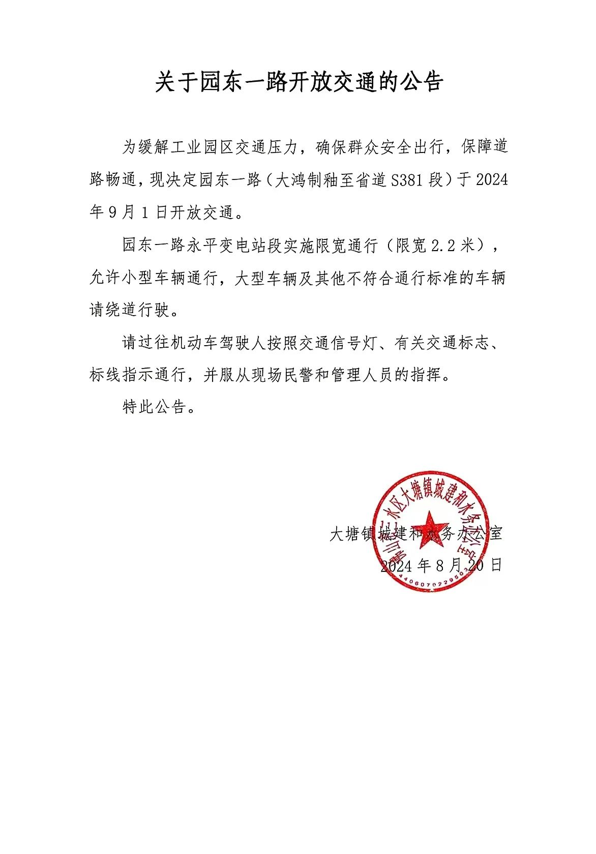 为缓解工业园区交通压力,确保群众安全出行,保障道路畅通,现决定园东一路(大鸿制釉至省道S381段)于2024年9月1日开放交通。
