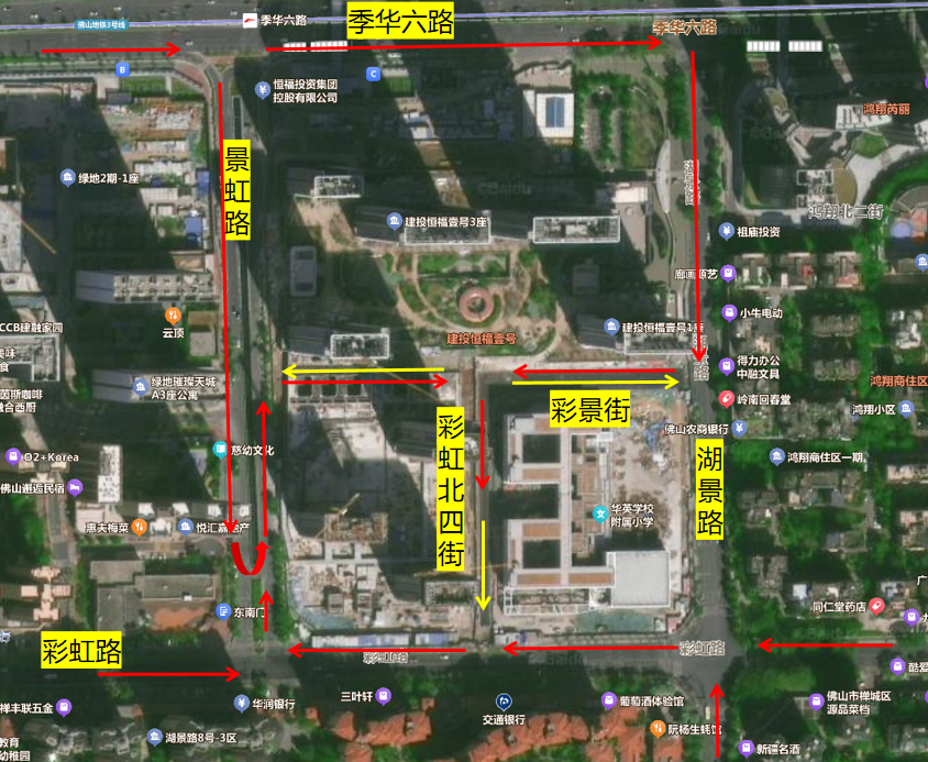 路线1:季华六路(西往东/东往西)→景虹路(北往南)→景虹路(南往北)→彩景街→彩虹北四街