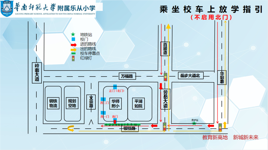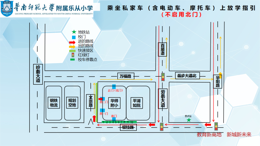 二、乘坐私家车(含电动自行车、摩托车)上学、放学指引1、乘坐私家车(含电动自行车、摩托车)上学、放学统一由银桂路进入,学校正门(北门)不启用。2、银桂路、文崇路、万福路实行循环通行,减少调头造成拥堵,保持通畅。3、华阳路、百顺道(含劳岳大道)的车辆向南行驶,进入银桂路,向西直行至文崇路右转,在学校西二门接送学生进出校园(西一门是学校地下车库车辆进出通道);然后右转行驶进入万福路,通过百顺道或岳步大道北离开。4、岭南大道的车辆,向南行驶至掉头处掉头后,在“永生宴会”右转进入万福路,因文崇路实行自南向北单向行驶,且学校北门不启用接送学生,所以车辆继续向东直行,右转进入劳岳大道、银桂路、文崇路,绕学校一圈,在学校西二门接送学生进出校园。然后右转行驶进入万福路向东直行,通过百顺道或岳步大道北离开。