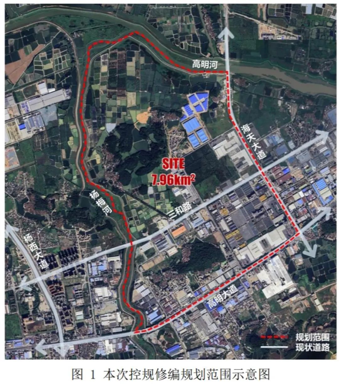 本次公示的规划区域北至高明河,南至高明大道,西至杨梅河,东至海天大道,总面积796.46公顷,其中建设用地 711.09 公顷,非建设用地 85.37 公顷。
