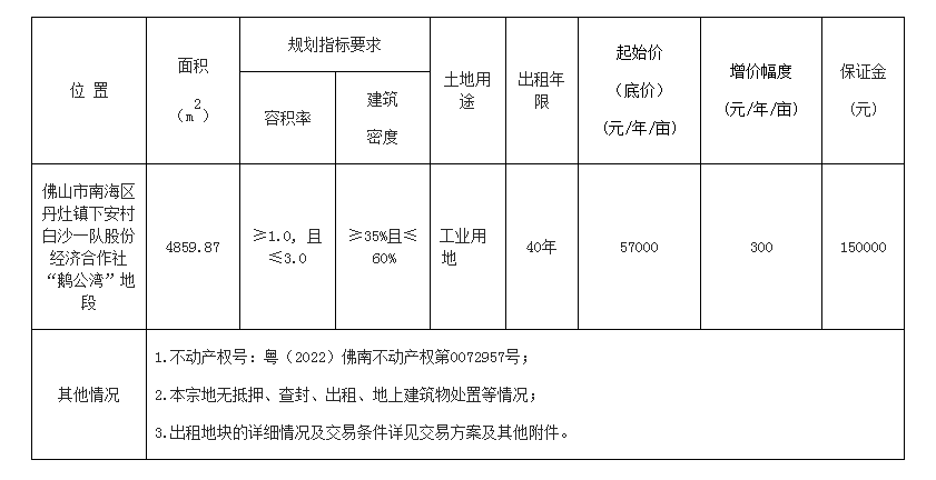 八、自本次公告起至网上挂牌截止期间,如有关于本地块网上挂牌出租文件的修改、澄清、说明等将通过上述网上交易系统、佛山市南海区人民政府网发布,不再另行通知,请有意参与竞租者密切留意。其它未尽事宜,详见本地块的网上挂牌出租文件。