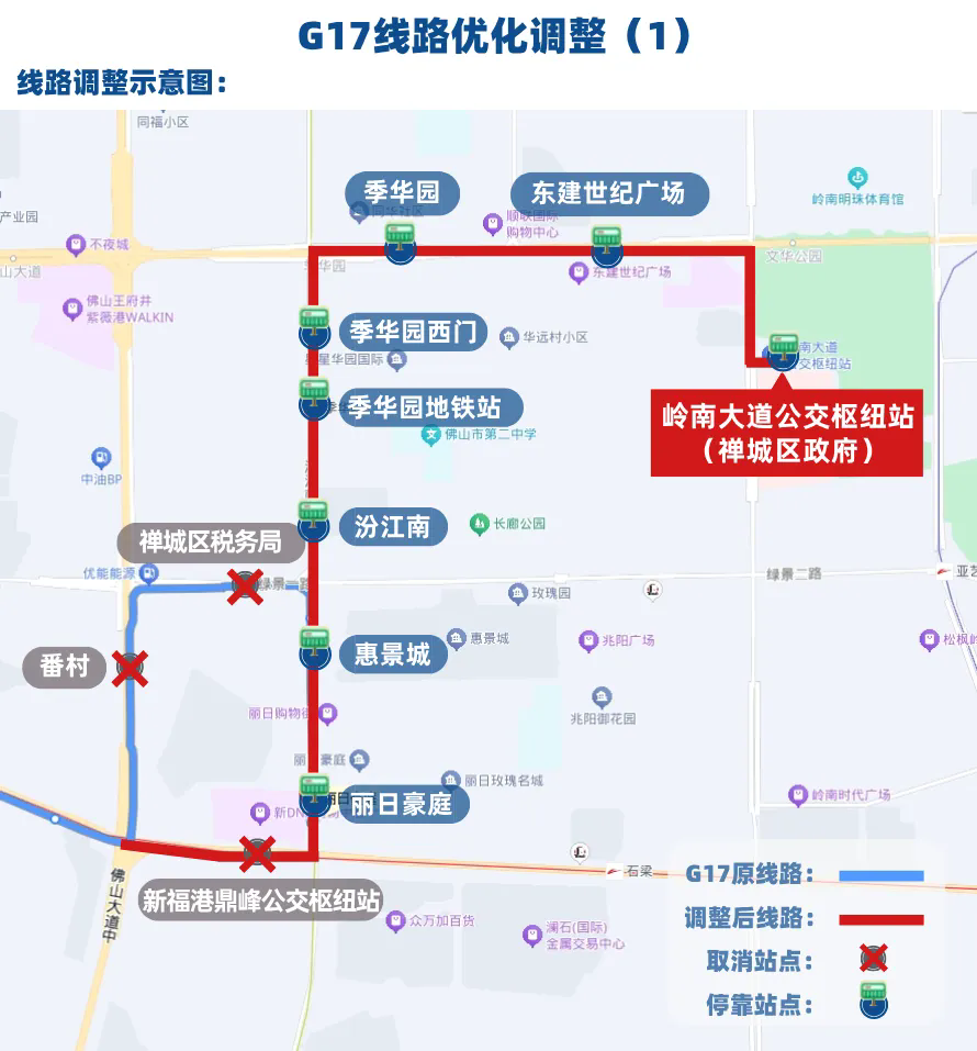 增加停靠:万科城、吉利市场(西)、过境路口(西)、南庄中队、吉利购物广场、丽日豪庭(东)、惠景城(东)、汾江南、季华园地铁站、季华园西门、季华园、东建世纪广场A站、禅城区政府、市一医院A站(东)、岭南大道公交枢纽站(禅城区政府)。