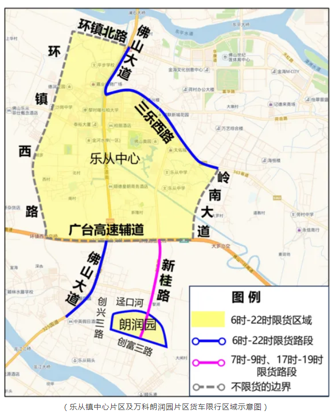 东以岭南大道为界,南以S5广台高速辅道为界,西以环镇西路为界,北以环镇北路、佛山大道、三乐路为界,每天6时至22时禁止中、重型货车通行,其他时段不限行。
