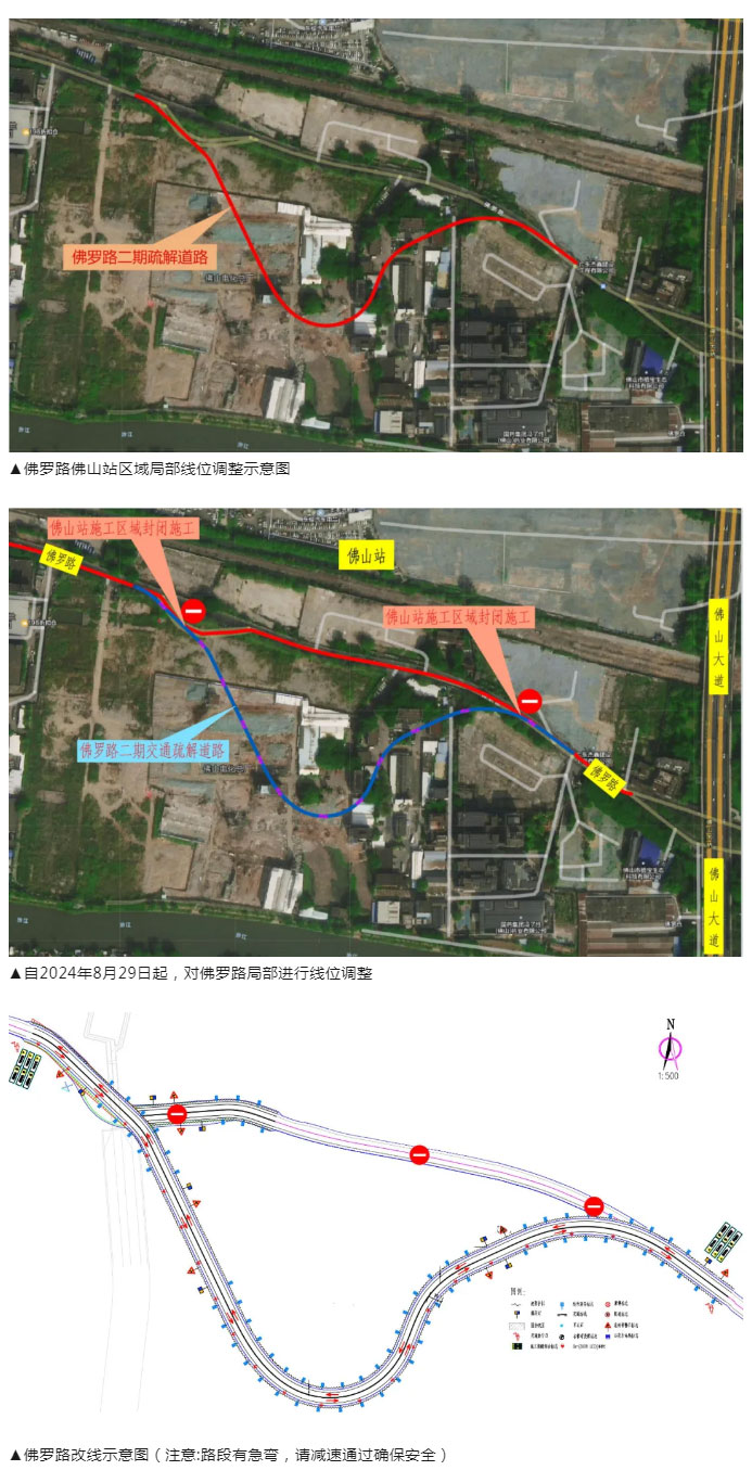 因广湛高铁佛山站施工需要,8月29日起佛罗路将进行局部线位调整。本次调整不影响行车路线,不压缩原有车道,可照常通行佛罗路。请市民途经时减速通过,按现场交通标志牌及交通协管员指引有序安全通行。佛罗路局部线位调整具体情况如以下图示: