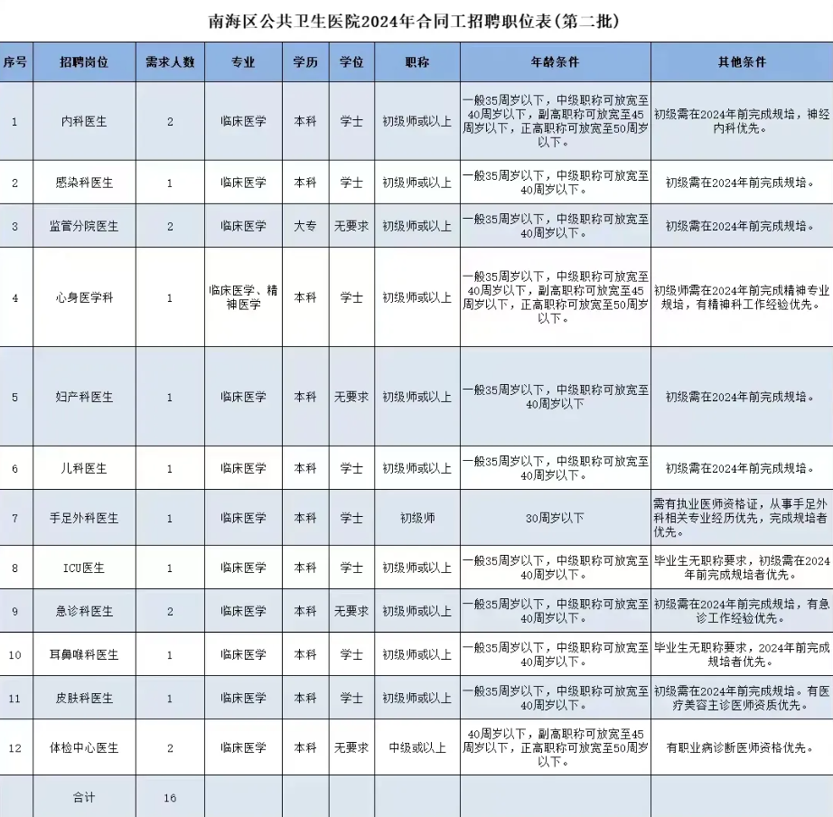 根据工作需要,佛山市南海区公共卫生医院公开招聘合同制专业技术人员16名。