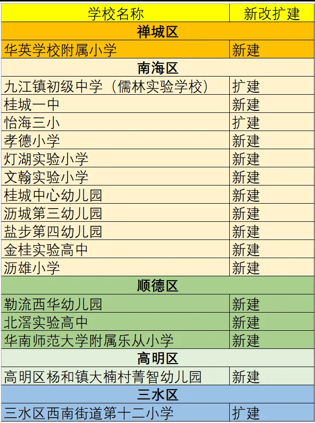 2024年,佛山有22所新(改、扩)建公办学校投入使用,新增学位26890个。其中,上半年已有高明区杨和镇大楠村菁智幼儿园、澜石中学场室改造工程、深村小学礼堂修缮及扩班项目等投入使用。9月份,佛山又有超10所新(改、扩)建公办中小学和幼儿园投入使用。