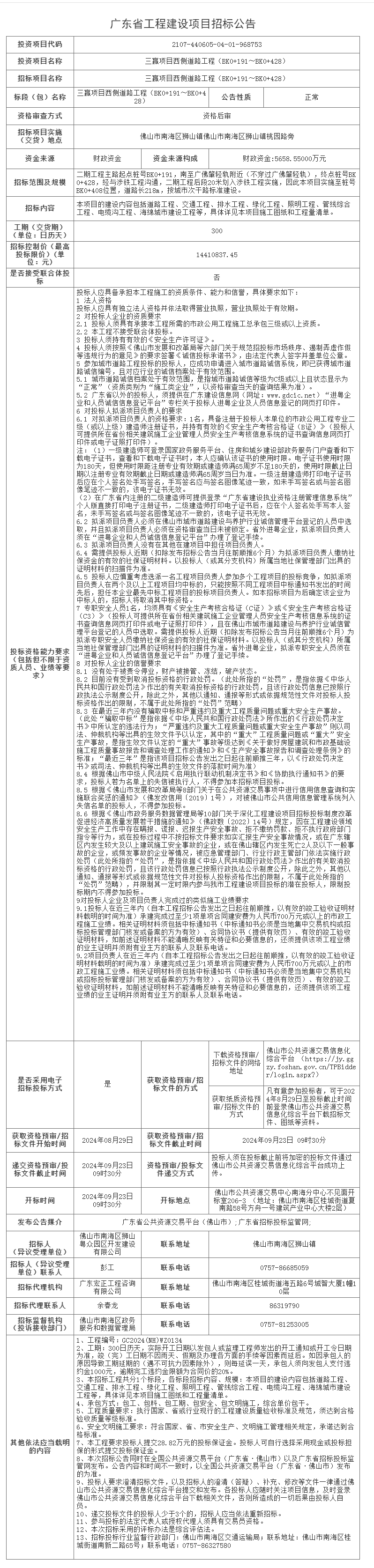 南海电子信息产业园宏岗地块规划三路工程项目招标公告