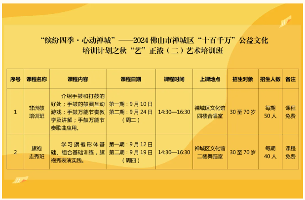我馆开展的秋“艺”正浓艺术培训班一经发布,学员们热情高涨,名额一抢而空!为了让大家有更丰富的文化体验,我们特别开启秋“艺”正浓(二)艺术培训班,新增非洲鼓和旗袍走秀培训课程。非洲鼓敲响心灵的节奏,让我们一起感受那原始而热烈的节拍!旗袍走秀展现东方之美,每一步都散发着古典韵味与现代风情!现在就加入我们,开启一段充满艺术与文化的旅程吧!