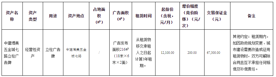 4.租金收取方式:租金采用先交付后使用的方式,租赁物移交竞得人之日起10日内,竞得人应向出租人缴清租赁物移交竞得人之日至当年度12月31日止的租金;此后,竞得人应于每年1月31日前向出租人缴清当年度1至6月租金,并于每年7月31日前向出租人缴清当年度7至12月租金。租金每满一年在上一期租金基础上递增3%。
