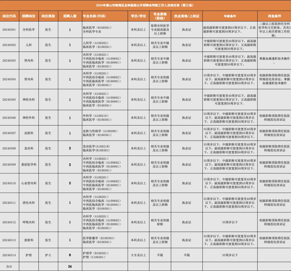 9.具备报考岗位所需其他条件。具体见附件1:2024年度佛山市南海区全科医院公开招聘合同制工作人员岗位表(第三场) 。