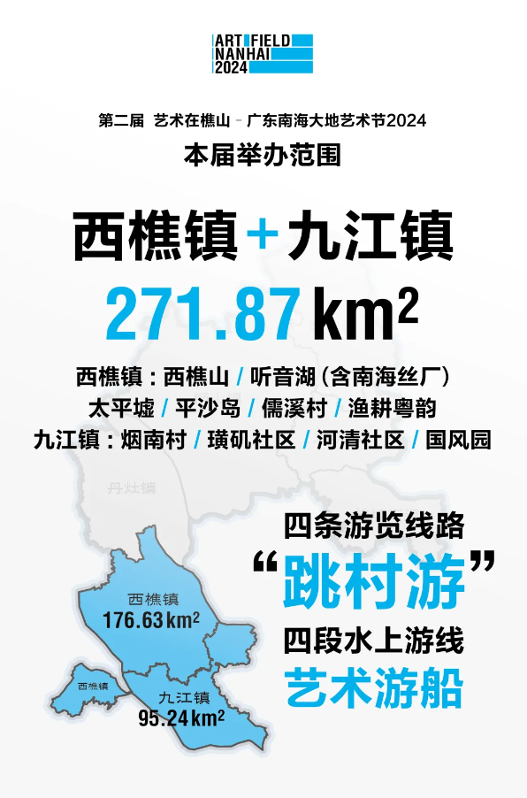 今年第二届“艺术在樵山-广东南海大地艺术节2024”将以西樵山为中心,沿着桑园围水脉出发,从西樵镇扩展延伸至九江镇。