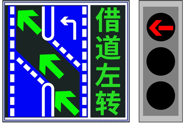 当显示屏显示绿灯“借道左转”,左转箭头灯红灯时,左转车辆可驶入借道区域等待左转信号灯转为绿灯通行。