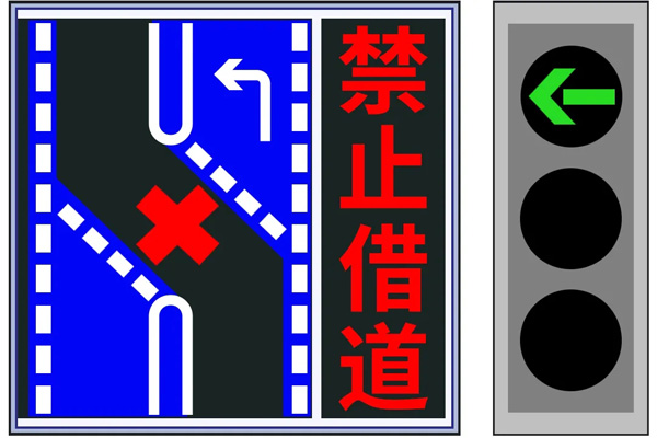 当显示屏显示红灯“禁止借道”,左转箭头灯绿灯时,左转车辆禁止驶入借道区域,已在借道区域车辆根据左转绿灯驶离路口。