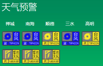 9月5日23时,顺德区、高明区将台风蓝色预警信号升级为黄色,禅城区、南海区、三水区维持台风蓝色预警信号。禅城区、南海区、顺德雷雨大风黄色预警信号生效中。
