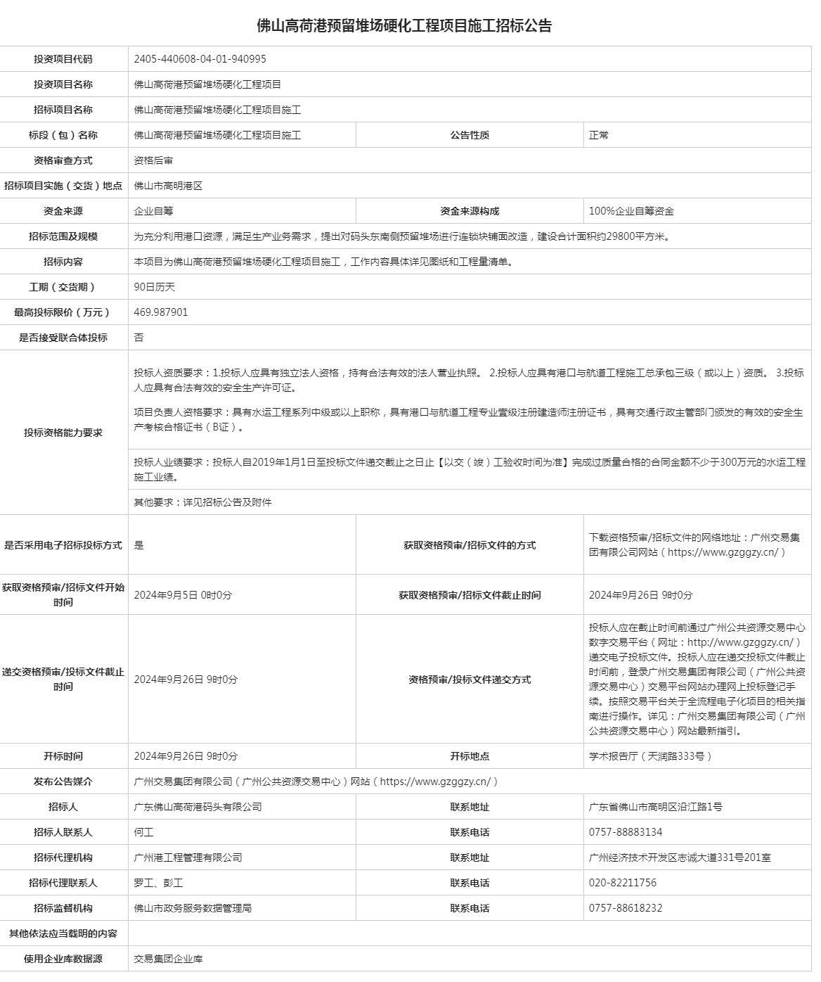 佛山高荷港预留堆场硬化工程项目施工招标公告