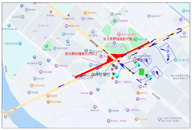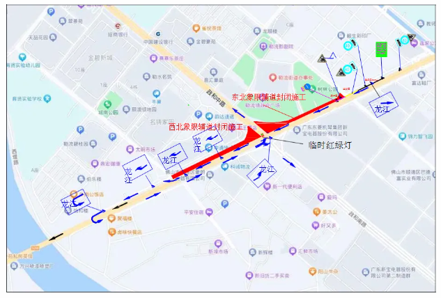 龙洲路政和路口北侧辅道(东往西方向),即勒流龙升北路至育贤大道段实行全封闭临时交通管制措施。
