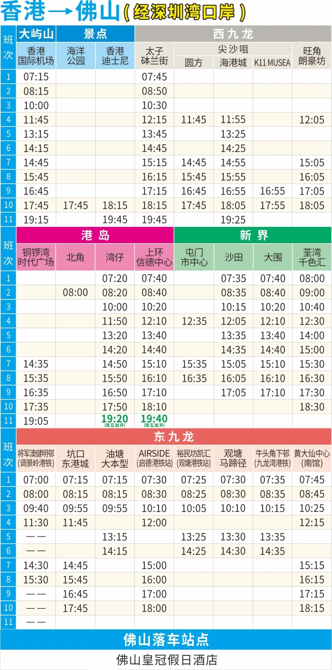 据了解,候机楼的服务时间为6:30至20:00,班次运作时间为6:30至17:10,约1小时一班,每日往返香港国际机场22班,节假日和旅游出行旺季会根据实际需要增加班次。佛山至深圳湾口岸使用粤港两地牌照豪华跨境巴士,深圳湾口岸至香港国际机场转乘埃尔法商务车,旅客在车上完成通关手续,全程约3小时直达机场,高效便捷。