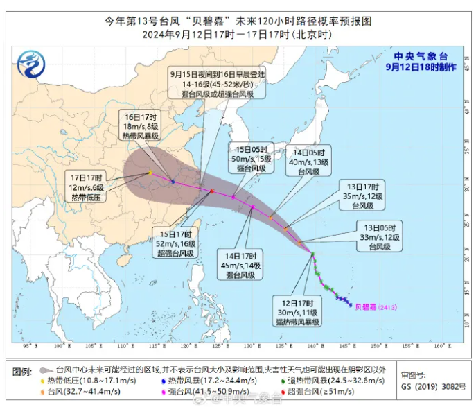 预计,“贝碧嘉”将以每小时25公里左右的速度向西北转偏西方向移动强度逐渐增强,9月14日夜间穿过琉球群岛后移入东海东部海面,之后向浙闽沿海靠近,将于9月16日凌晨至上午在浙江至福建北部一带沿海登陆,登陆时中心附近最大风力有14~16级(45~52米/秒,强台风级或超强台风级)。