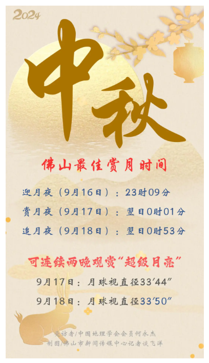 9月17日迎来2024年中秋节,也将上演本月天文舞台的“重头戏”之一——“超级月亮”。中国地理学会会员何永杰介绍,今年中秋月为“十五的月亮十六圆”,佛山最佳赏月时间为9月18日0时01分(农历八月十六);如果天气晴好,市民可在八月十五、八月十六连续两晚观赏“超级月亮”。