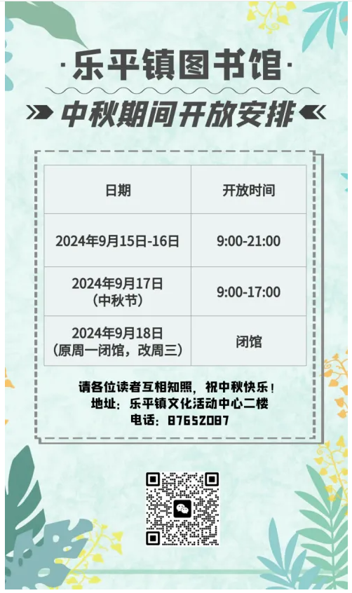 乐平镇图书馆2024年中秋假期开放时间